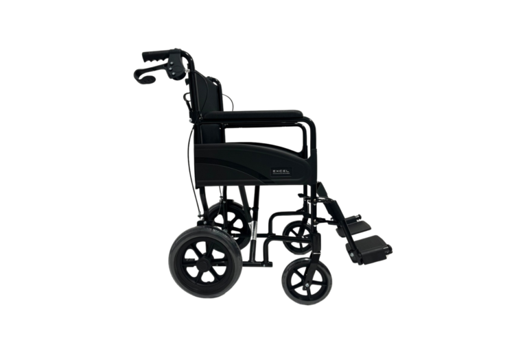 The Excel Access wheelchair is a comfortable, lightweight aluminium Transit wheelchair, with a really helpful range of high quality features. With its ultra compact frame and lightweight foldable design, the Access wheelchair is perfect for travel. All features of this chair have been designed to make life easier for the user. Features include, attendant brakes, removable swing-away footrests, padded armrests, a lap belt, calf strap, vinyl armrests and padded Nylon seating as well as backrest all standard. This is one of the more attractive transit wheelchairs on the market with its modern black metallic frame. All together this model offers great value for money and is one of the best value transit wheelchairs that we stock. The Access is suited for both indoor and outdoor use.
