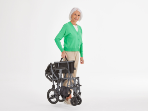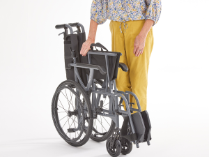Other features include flip-up armrests for easy side transfer, a storage bag on the rear of the backrest and lift handles for easy transportation.