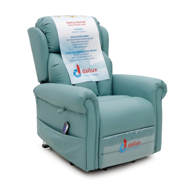 The Nevis Healthcare chair comes in a Standard size with a triple motor mechanism, providing independent rise and recline, and a powered headrest. It is designed for those requiring pressure relief, without compromising on comfort or durability.