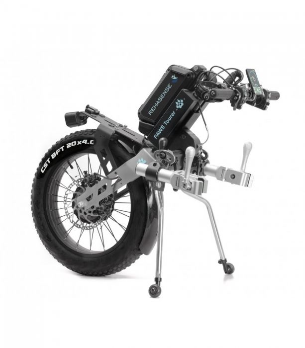 PAWS Tourer has the longest wheelbase. The big wheel overcomes roots and uneven terrain, it also makes a smooth ride while touring. With a 20” wheel and 4” fat tyre, you will easily get to places that would be difficult for other models. Designed primarily for off-road purposes, it is not afraid of sand, gravel, or stones. Automatic Easy Clamps. Long lever arms and Quick Release Clamps make manual clamping quick and easy. Adjustable handlebars. Customise the set-up with different configurations of clamps, steering, wheels, and accessories for optimal use and fit. Tetra Controls – allow you to drive easily, even with diminished upper extremity strength and control. The brakes can be operated by one hand or both, if heavy braking is needed