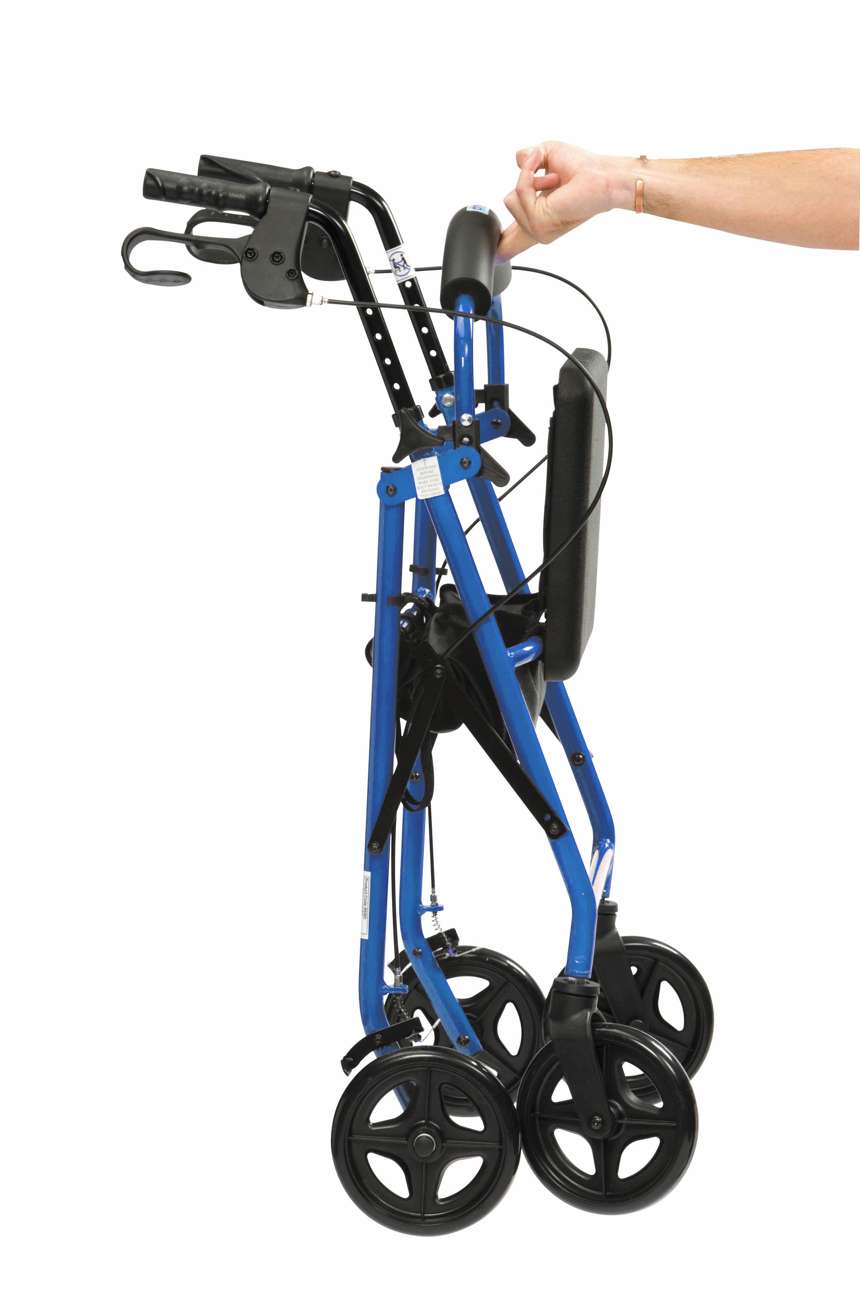 The R6 Rollator has a rustproof and robust aluminium frame. The R6 features looped cable brakes and a curved and padded backrest for comfort. Swivelling front wheels increase manoeuvrability, while the padded seat flips up easily for access to storage bag or for folding.