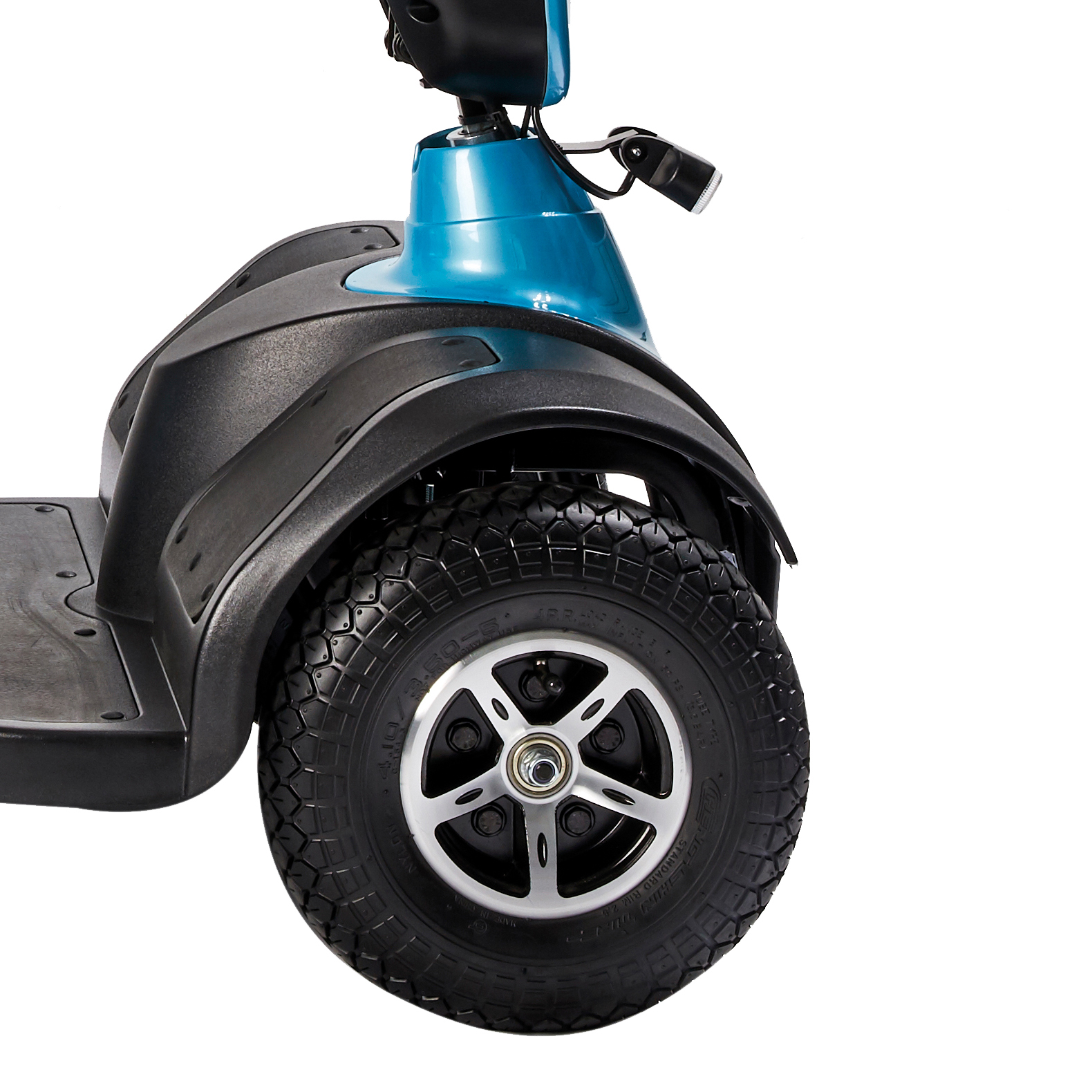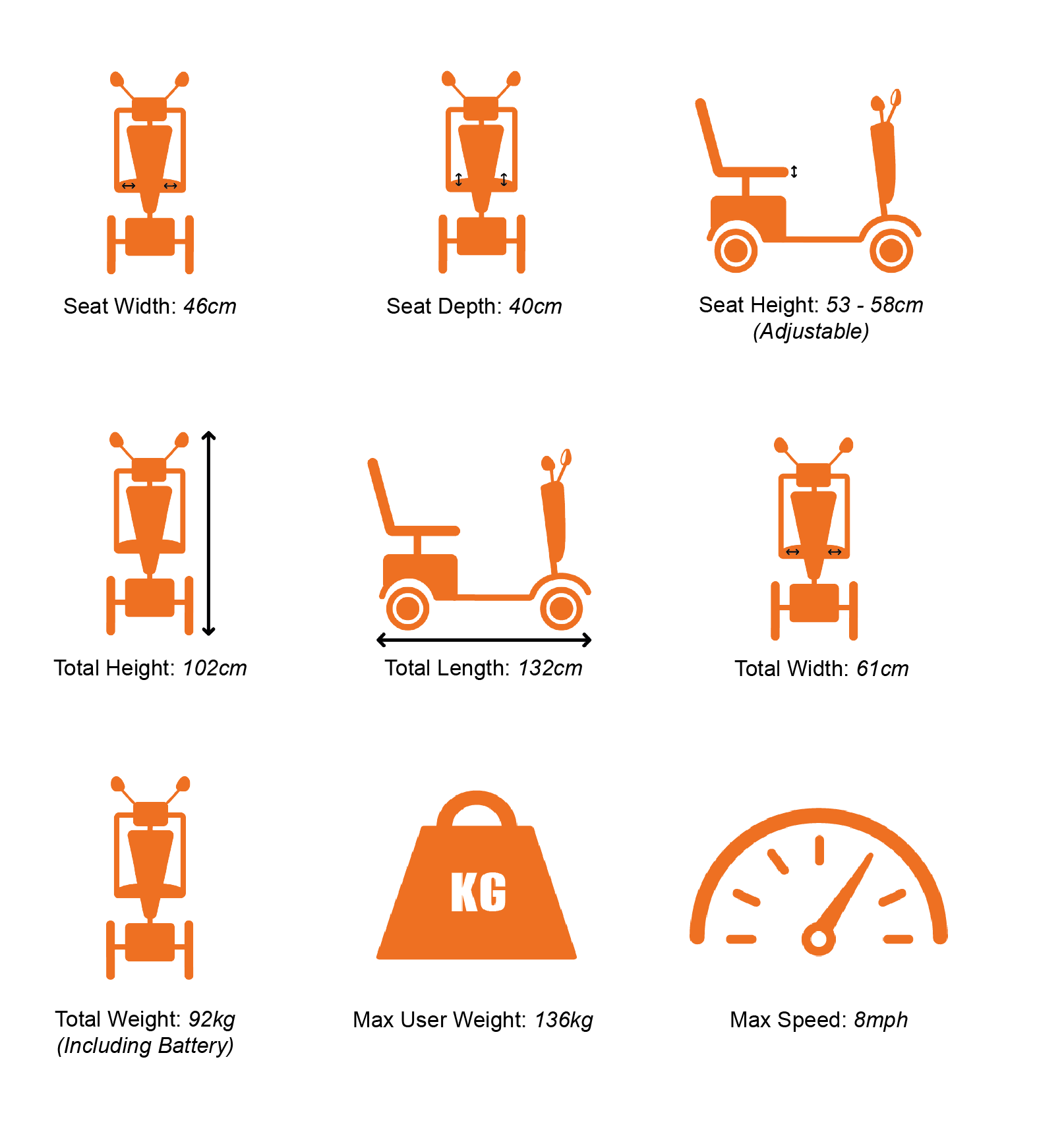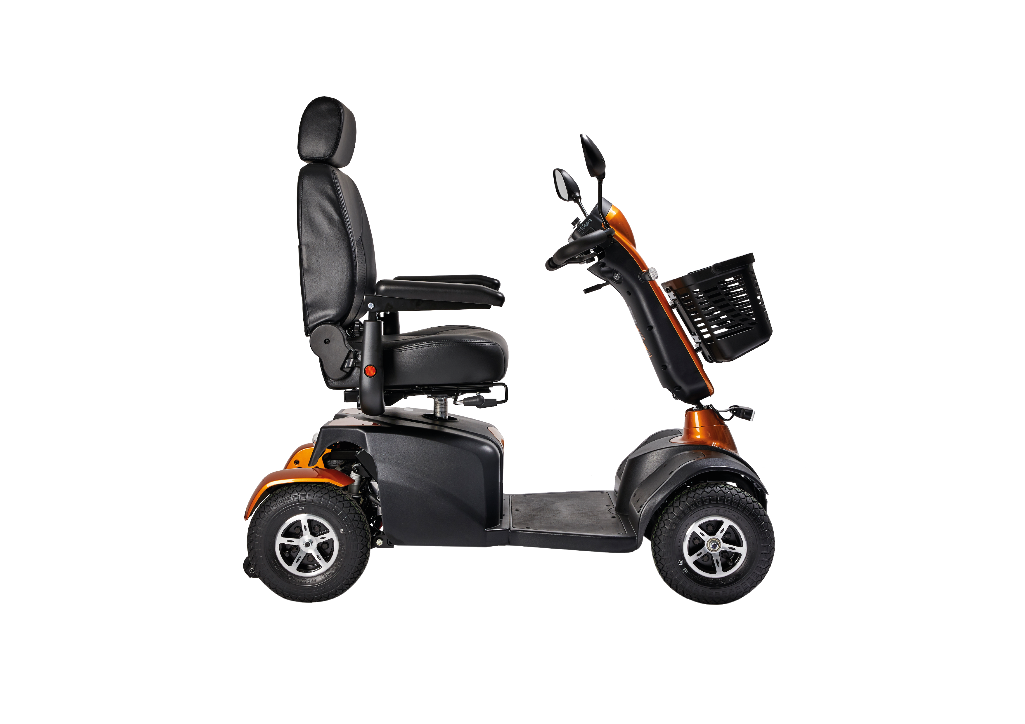 The Roadster DX8 Deluxe is just as striking as the original DX8, but now featuring a new 4-pole technology motor, suspension and larger 12 inch wheels for increased range. This 8 mph road scooter boasts pneumatic tyres, angle adjustable tiller, width adjustable armrests, new contoured sports Captain seat swivel chair and available in 4 metallic colour options with a new modern two-tone shroud design, incorporating full LED lighting for increased road safety.